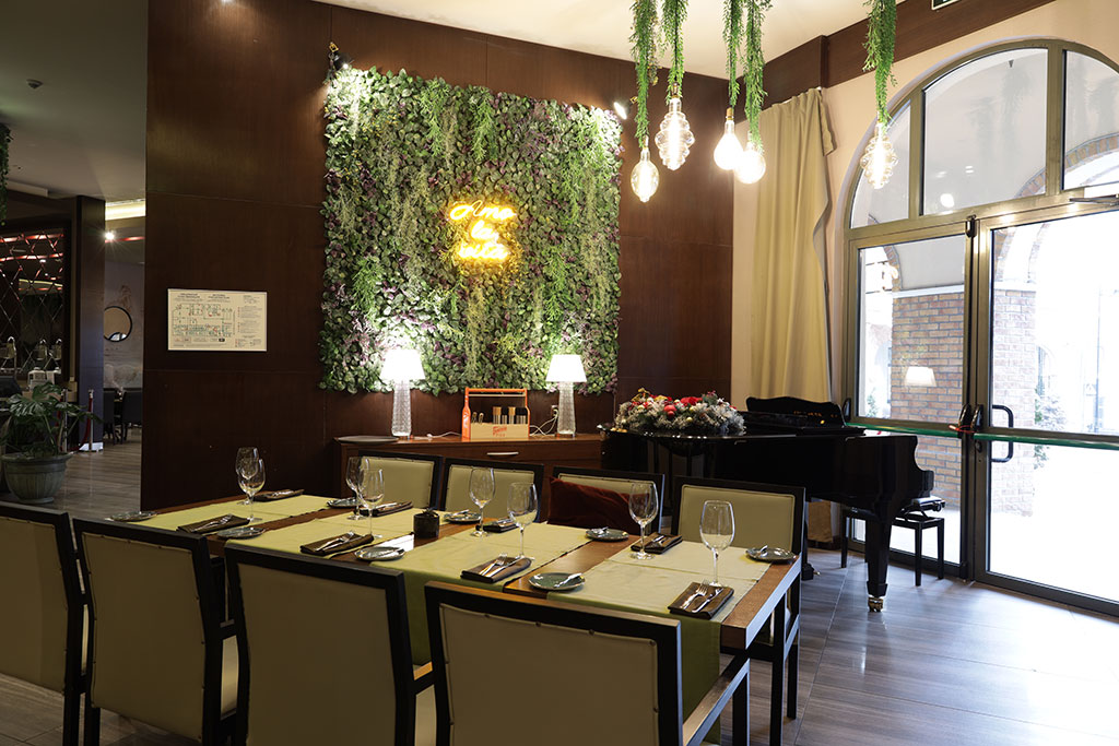 На первом этаже отельного комплекса «Горки Панорама» расположен уютный лобби-бар, где туристы могут приятно проводить свободное время. Интерьер состоит из большой барной стойки с высокими стульями, лаундж зоны с мягкими диванчиками и небольшими столиками. В баре подают блюда итальянской кухни, такие как пицца, панини и другие. Лобби-бар работает с 8 утра до 12 ночи и подходит для приятного досуга.