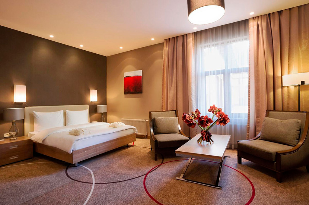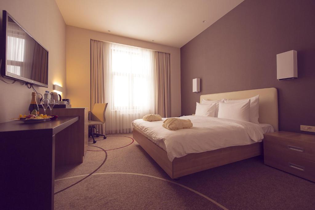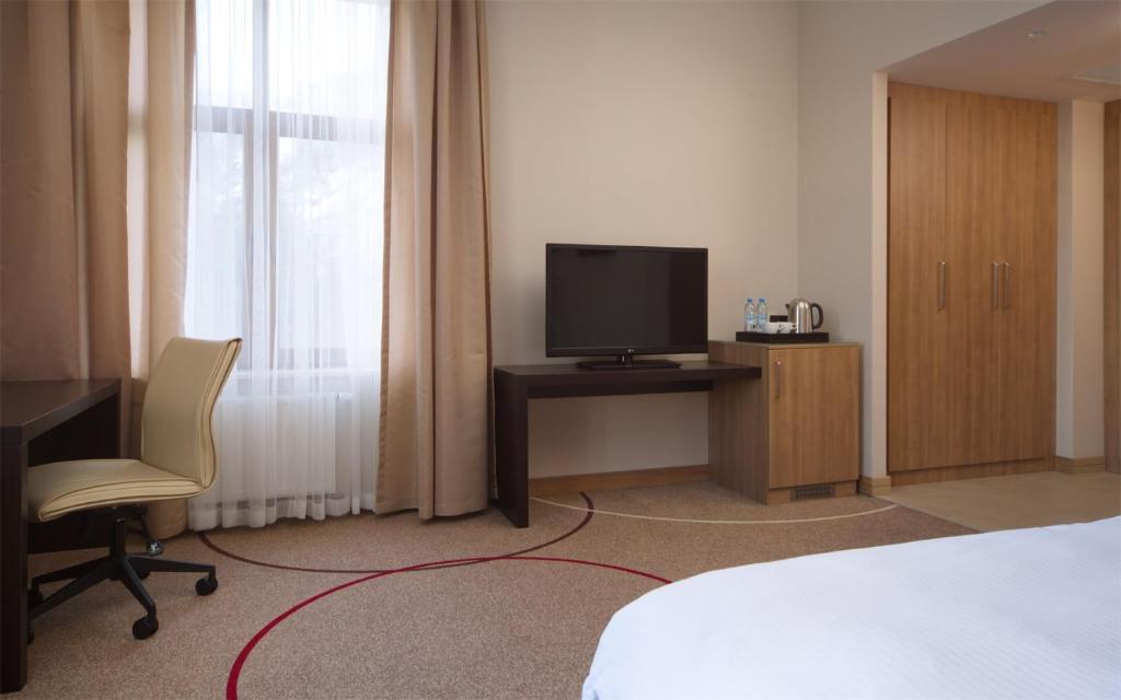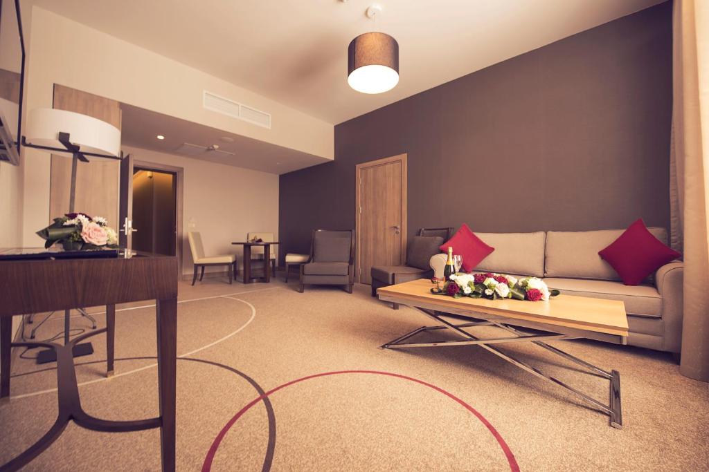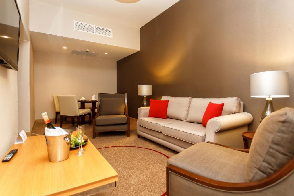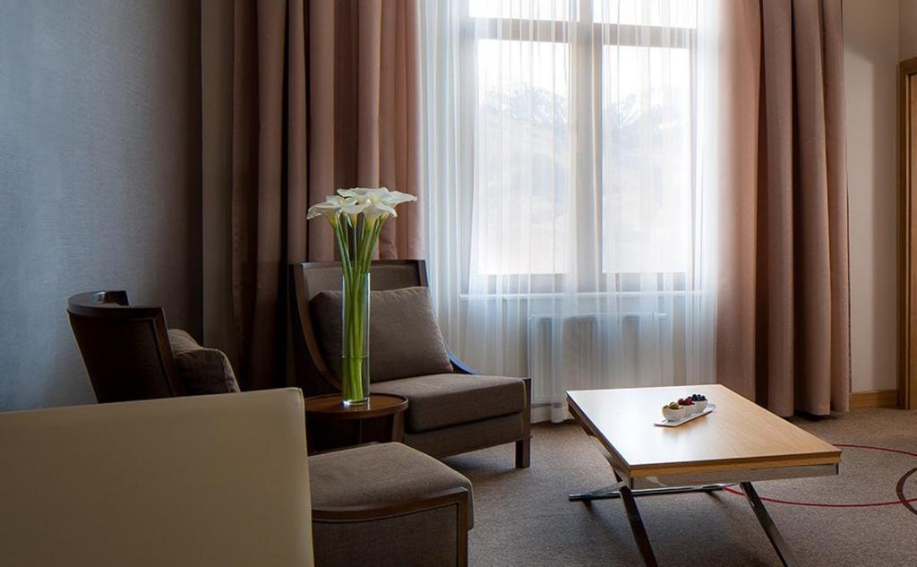 В номере: широкая кровать, журнальный столик, диван, кресла, трюмо, пуф, вешалка, зеркало и полочка для обуви. Ванная комната с душем. Из техники есть плазменный ТВ, кондиционер, сейф. Эти люксы оснащены звуковыми и световыми устройствами для оповещения, расширенными дверными проемами.