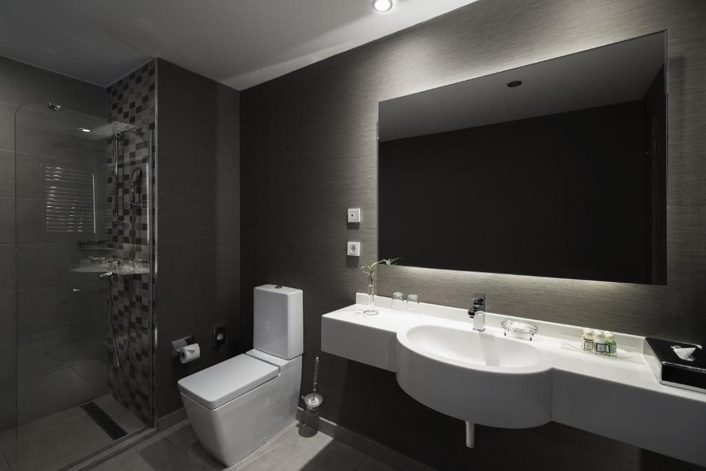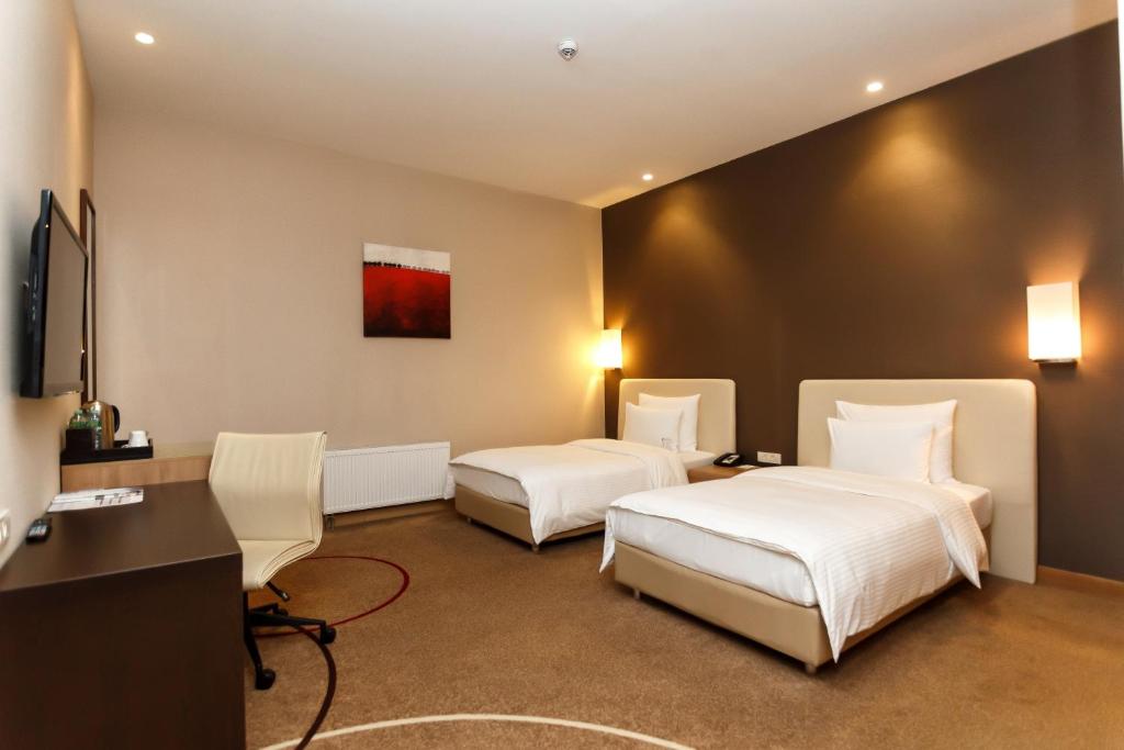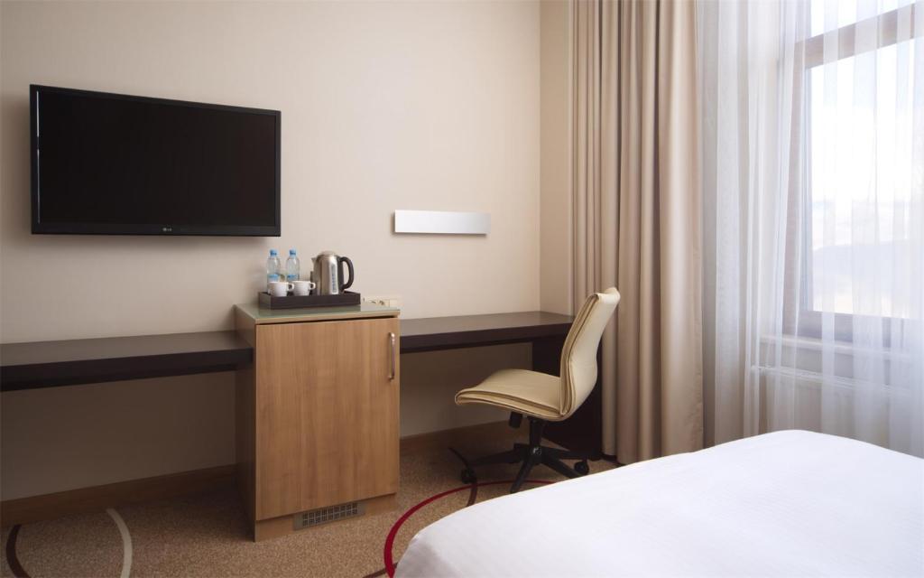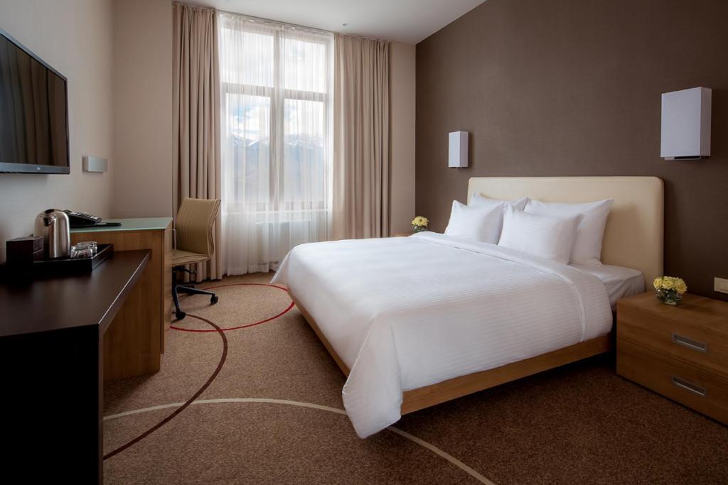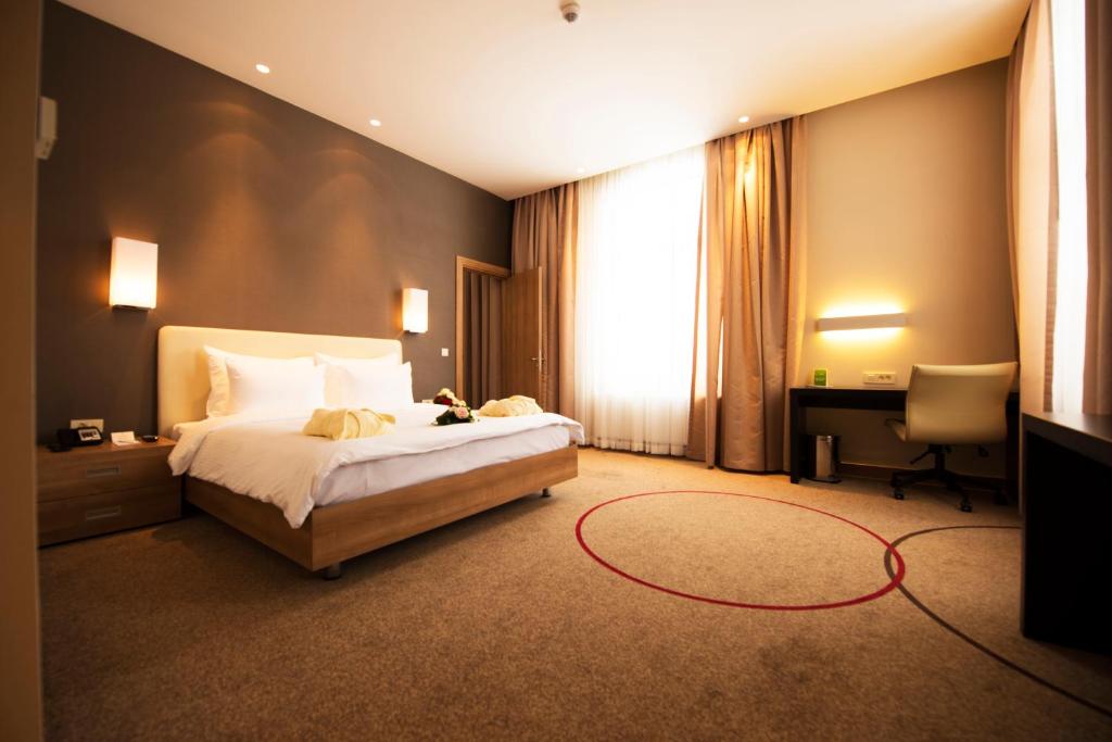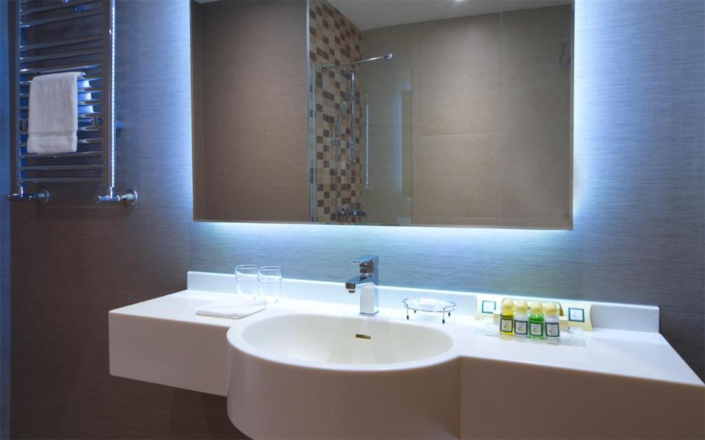 В номере: широкая кровать, журнальный столик, диван, кресла, трюмо, пуф, вешалка, зеркало и полочка для обуви. Ванная комната с душем. Из техники есть плазменный ТВ, кондиционер, сейф. Эти люксы оснащены звуковыми и световыми устройствами для оповещения, расширенными дверными проемами.